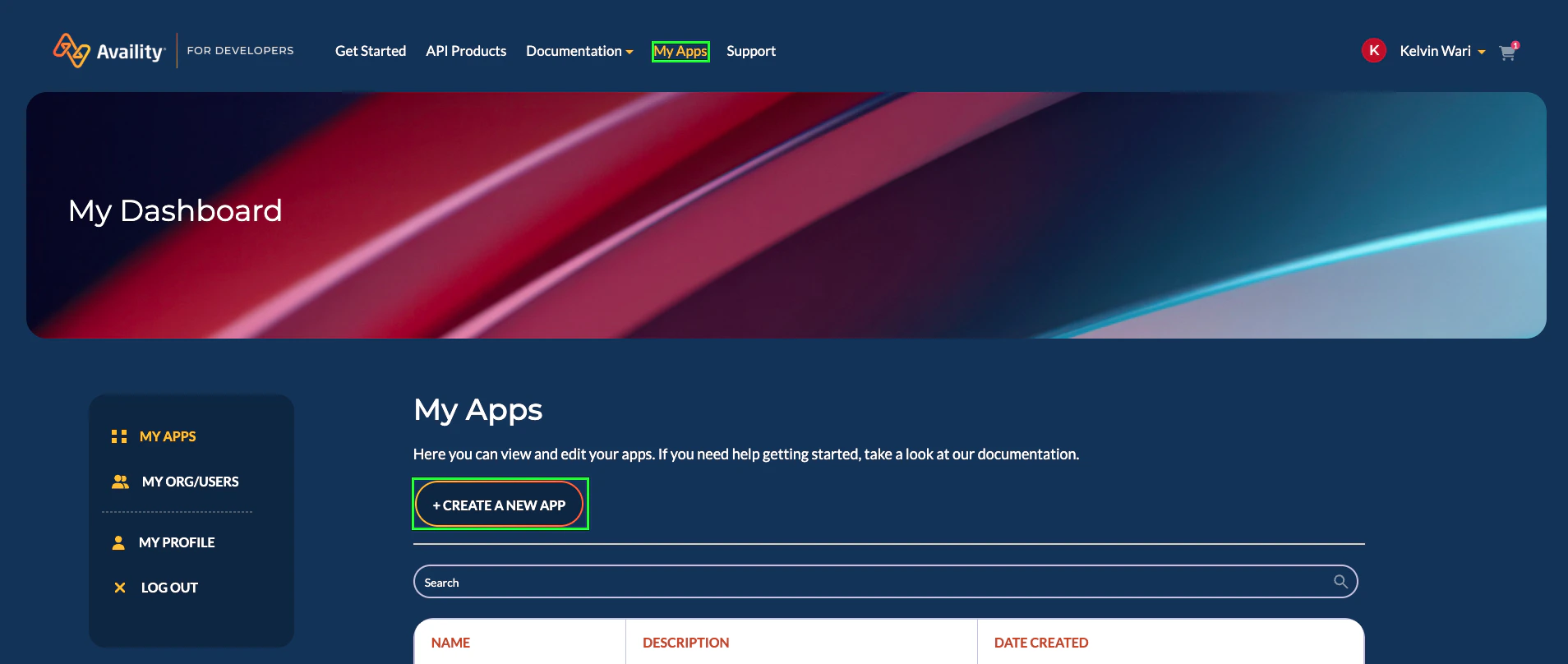 2. Select My Apps in the menu bar, then select Create a New App.