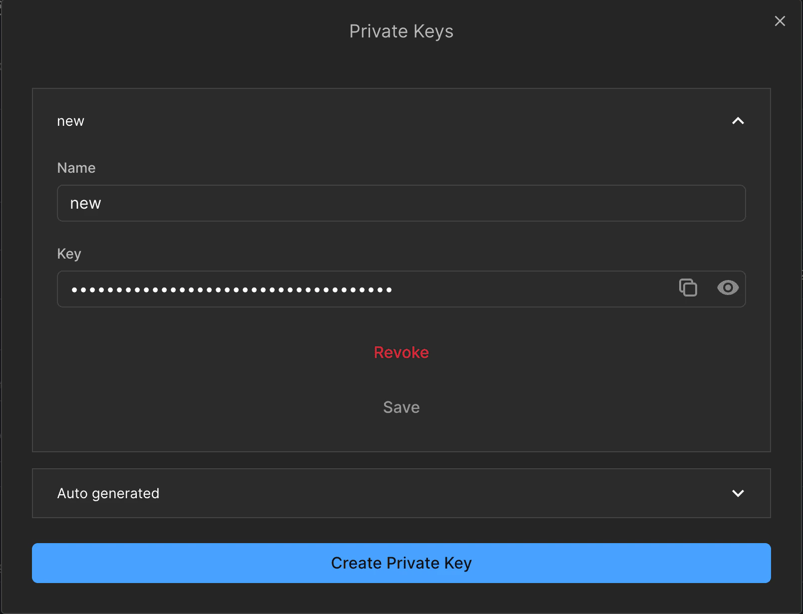 1. In the modal, view your existing private API key or create a new one if needed.