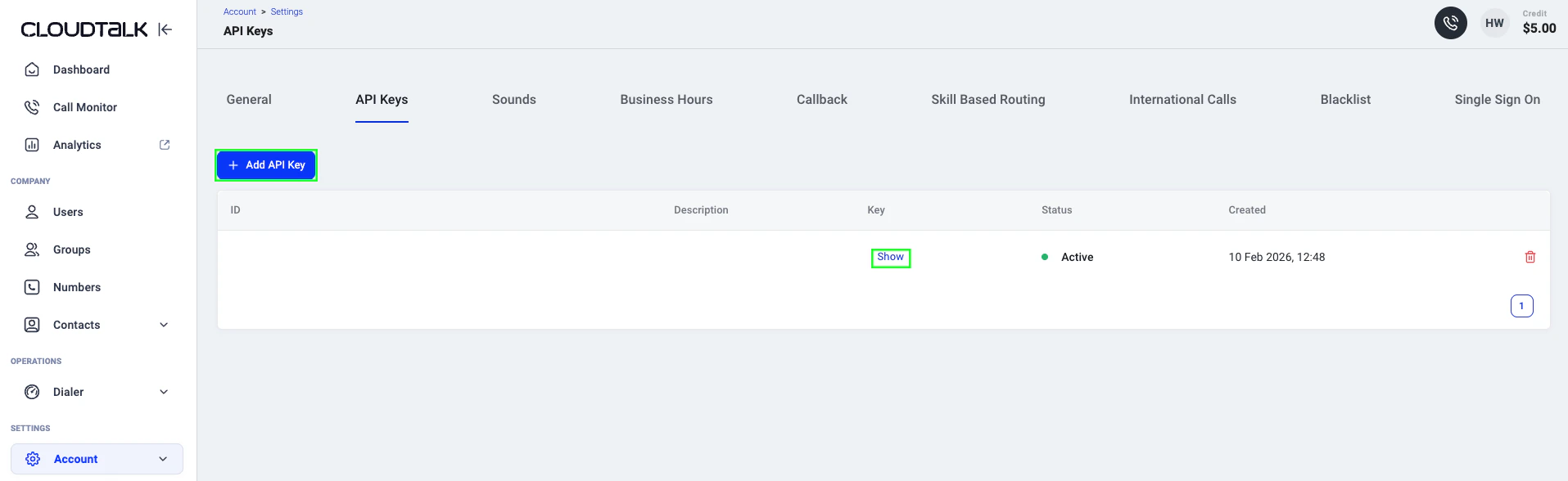 - Log in to your CloudTalk Dashboard and go to the API Keys page.