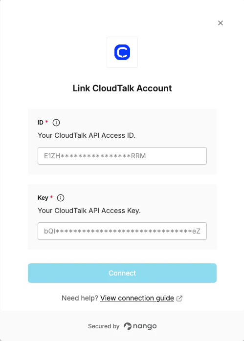 To authenticate with CloudTalk, you will need:- ID – Your CloudTalk API Access Key ID; used as the Basic Auth username.