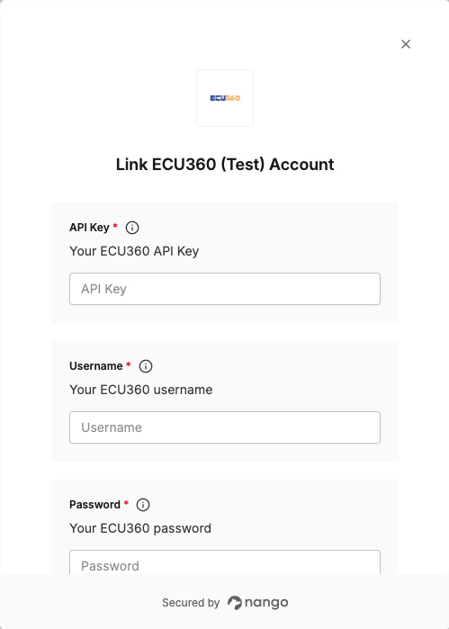 To authenticate with ECU360 (Test), you will need:- API Key - Your ECU360 API key for authentication.