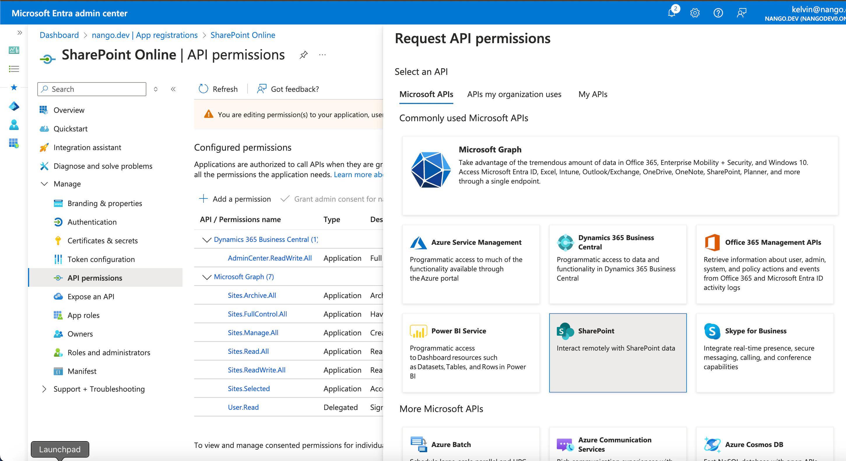 2. From the displayed list, choose Application permissions, select the required permissions, and click Add permissions.