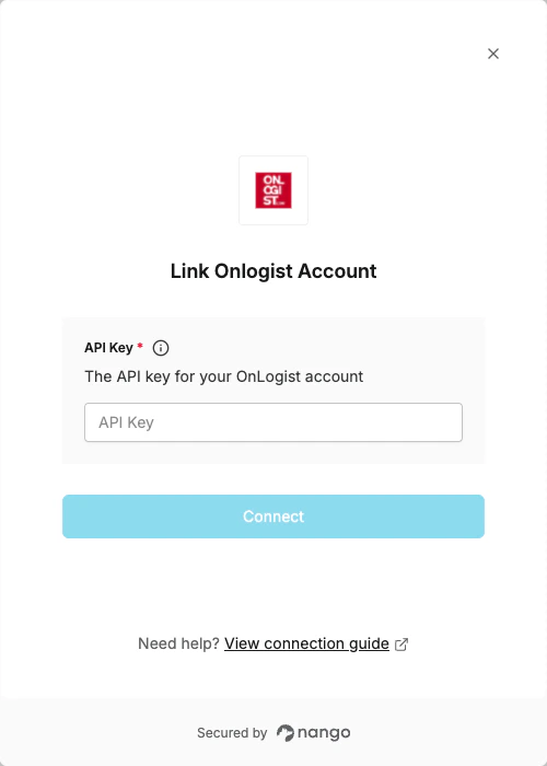 To authenticate with OnLogist, you will need:- API Key - A key that grants secure access to the OnLogist API, enabling authorized applications to interact with OnLogist resources and services.