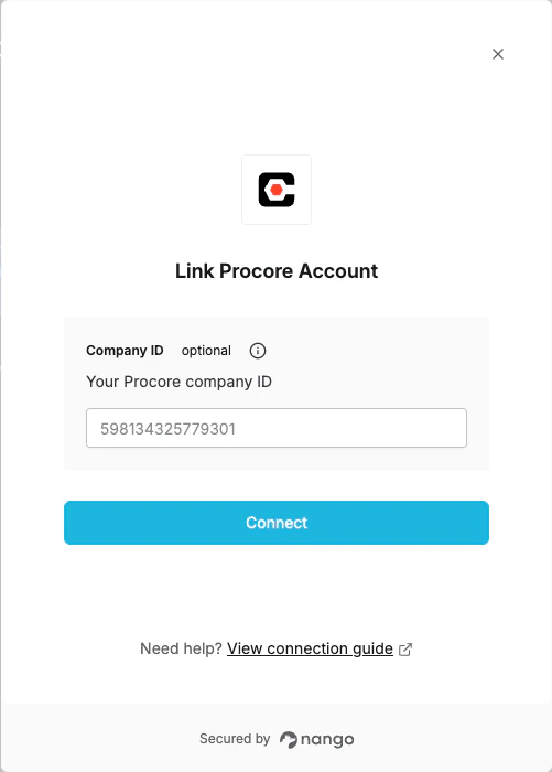 To authenticate with Procore, you will need:- Company ID (optional) - The ID of the Procore company you want to connect to.