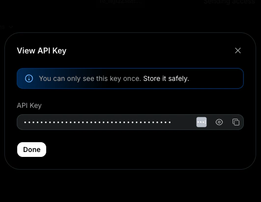 - Your API key will be generated. Store it securely—it is only displayed once.