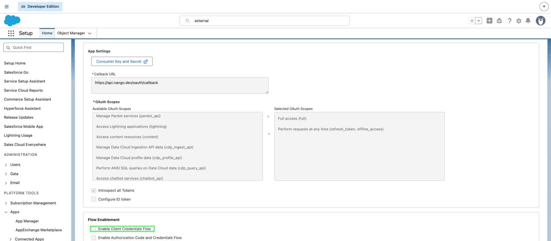 • In OAuth Settings: Under Flow Enablement, check Enable Client Credentials Flow.