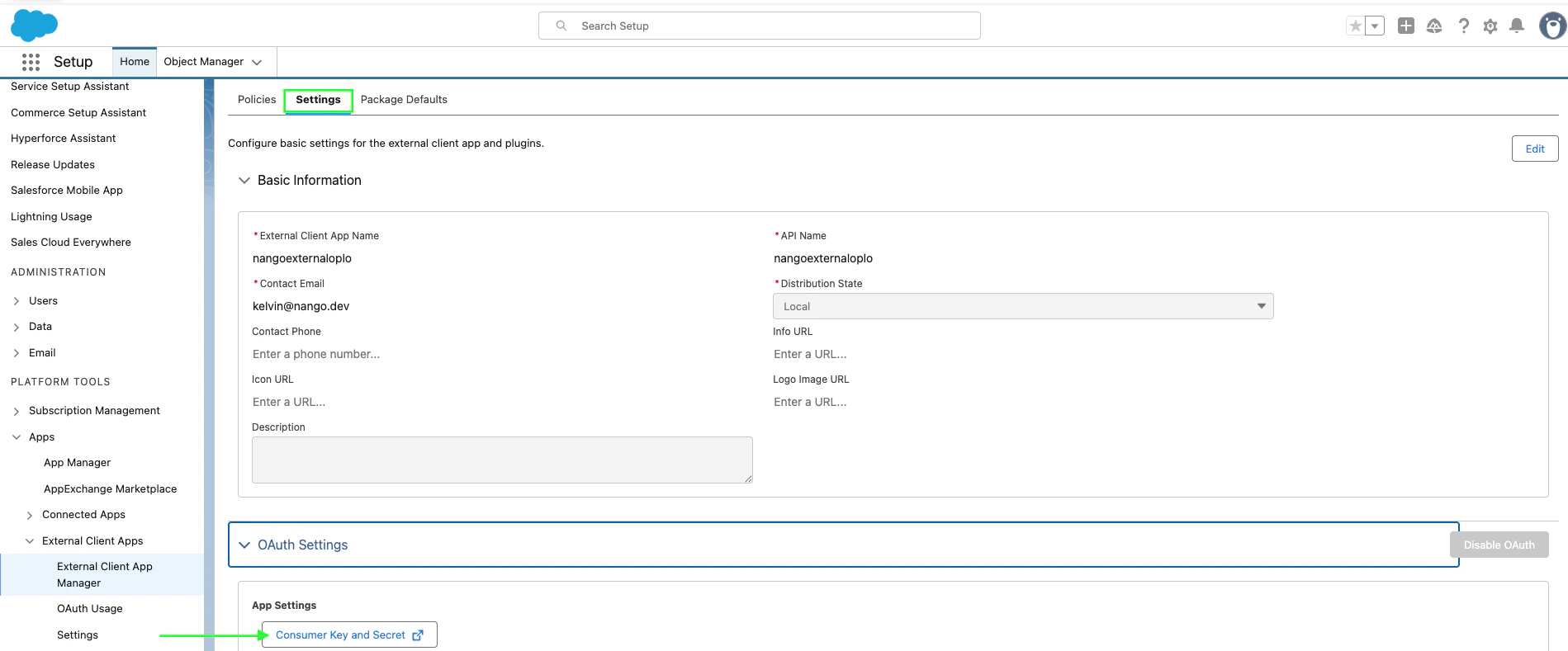 - Expand the OAuth Settings section and click Consumer Key and Secret.