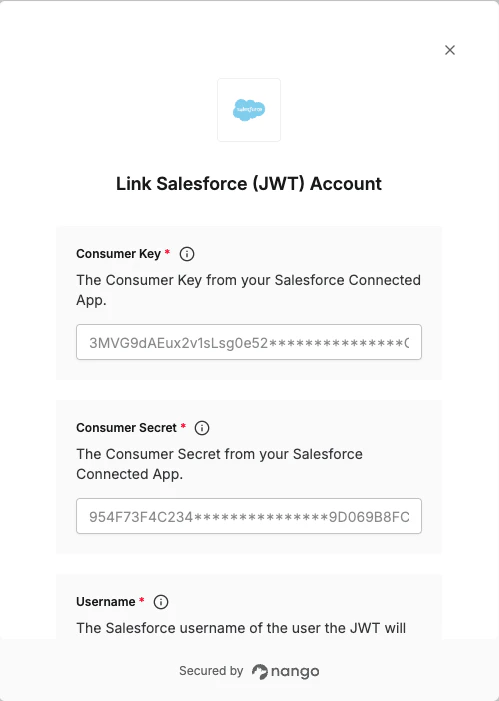 To authenticate with Salesforce using JWT, you need:- Consumer Key – from your Salesforce External Client App