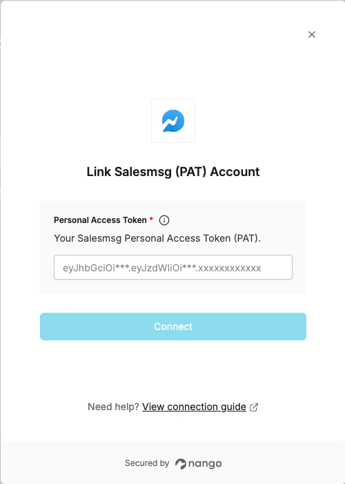 To authenticate with Salesmsg (PAT), you need:- Personal Access Token - A key that grants secure access to the API, enabling authorized applications to interact with Salesmsg resources and services.