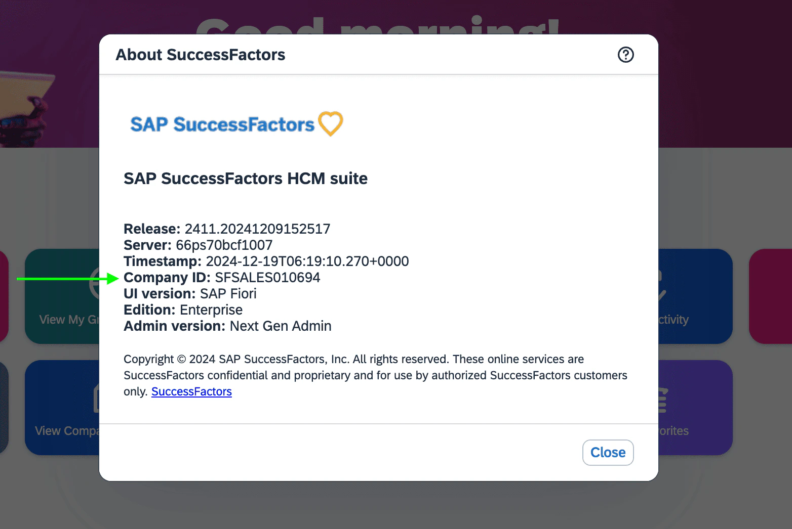 - To find your SAP SuccessFactors Company ID, in the same dropdown menu, click Show version information. Locate Company ID in the modal that pops up: