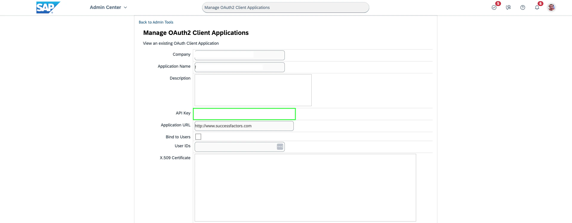 - API Key - The API Key (Client ID) generated during the OAuth client application registration process in SAP SuccessFactors.