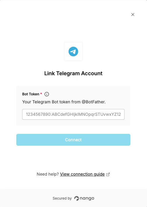 To authenticate with the Telegram Bot API via Nango, you will need:- Bot Token – Your Telegram Bot API token from @BotFather.
