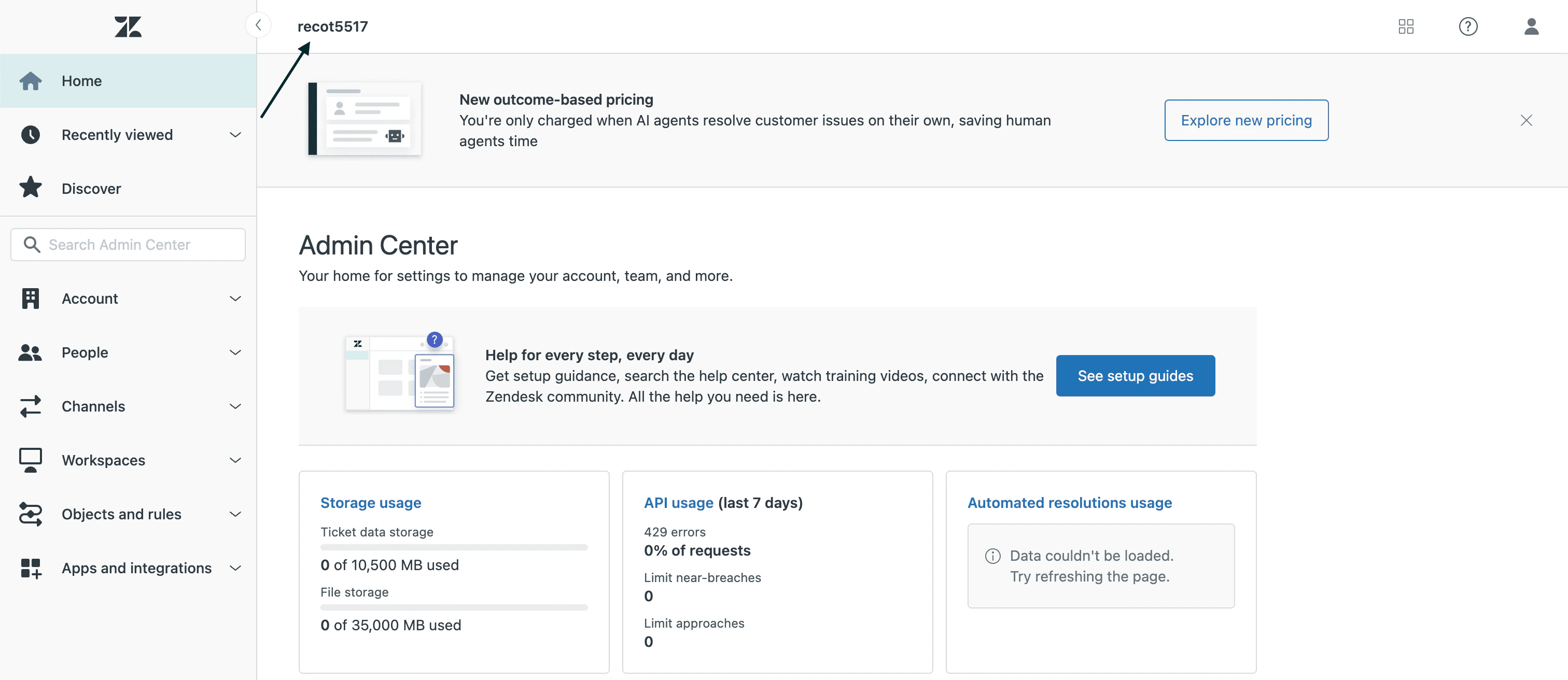 - Log in to your Zendesk Admin Center home page. You can locate your subdomain at the top.