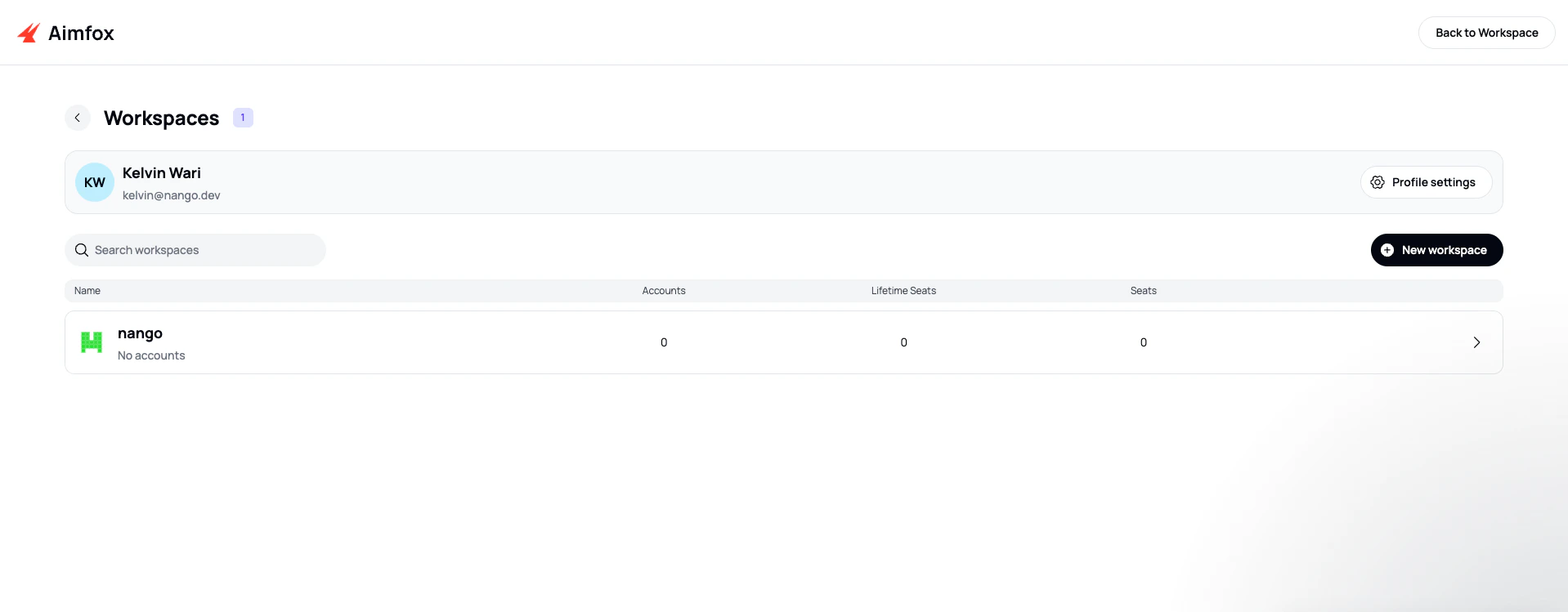 - Log in to your Aimfox dashboard and go to your Workspaces list.