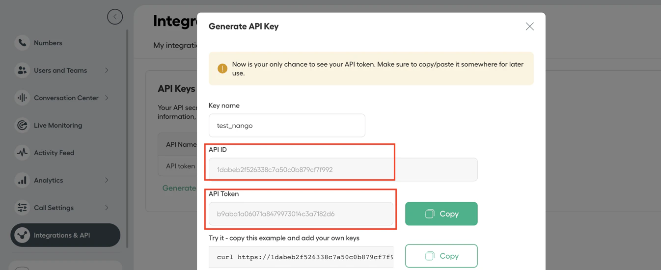 To authenticate with Aircall (Basic Auth), you need two key pieces of information:- API ID - A unique identifier for your application on Aircall.