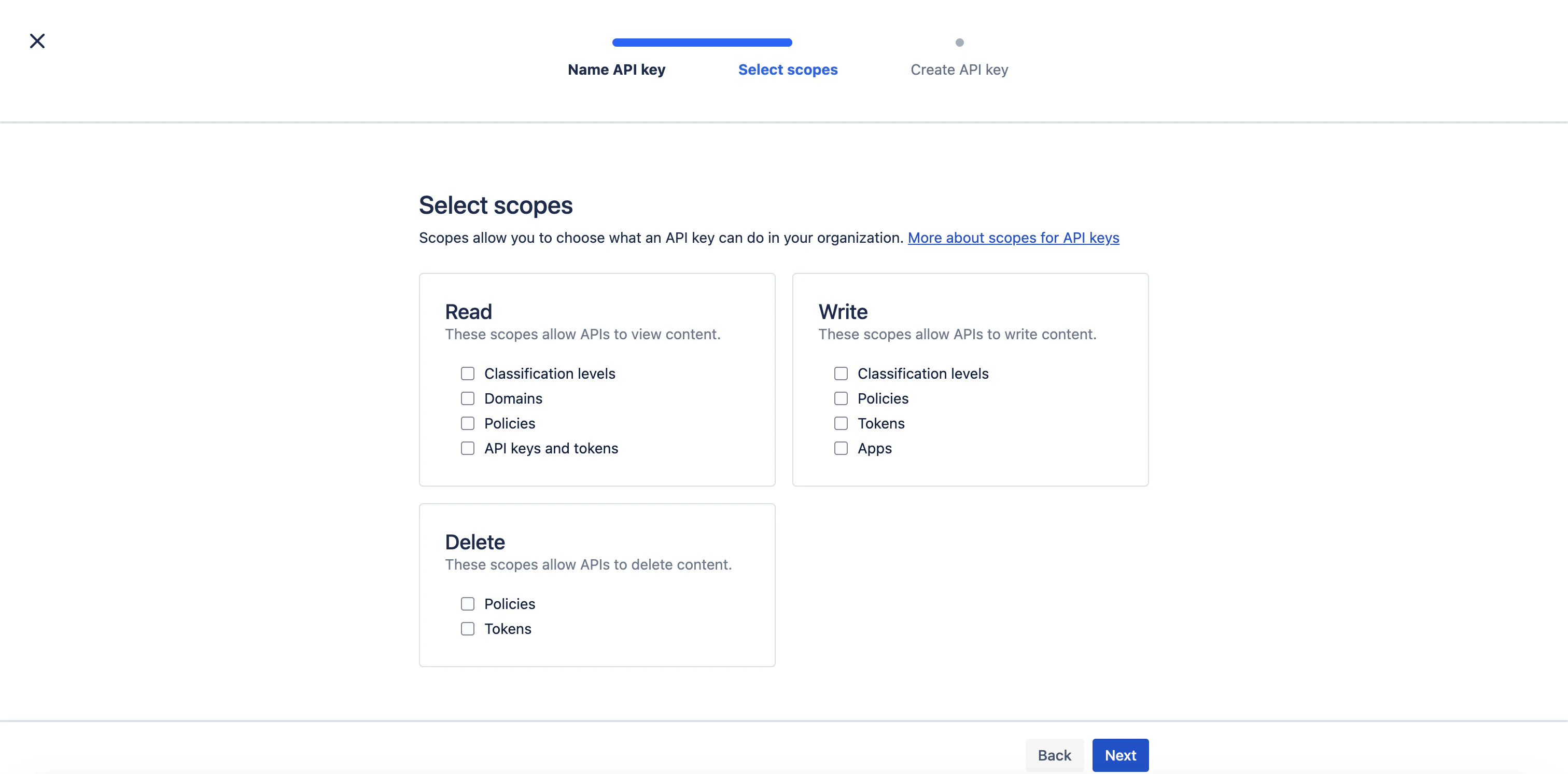 - To create an unscoped key: Click API keys without scopes, then Next.