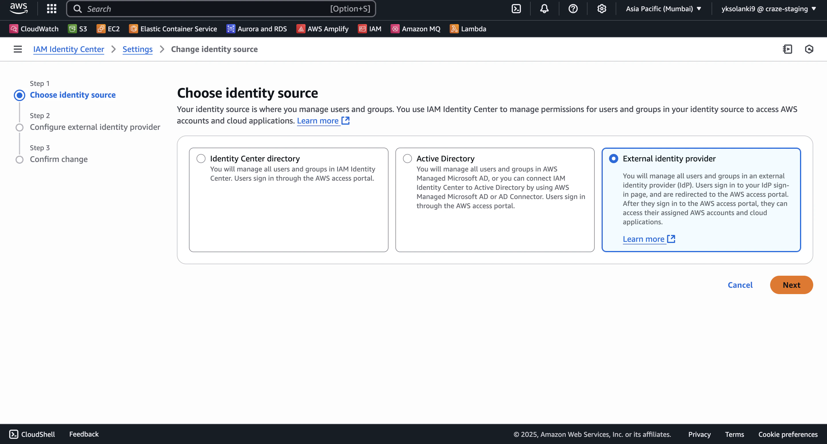 - Choose External identity provider as your identity source