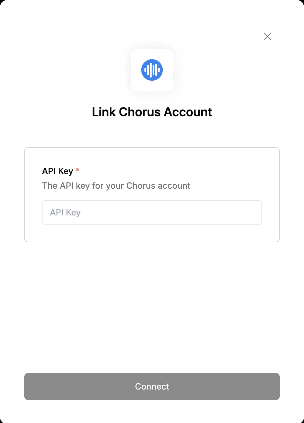 To authenticate with Chorus, you need:- API Key - Your Chorus API Key
