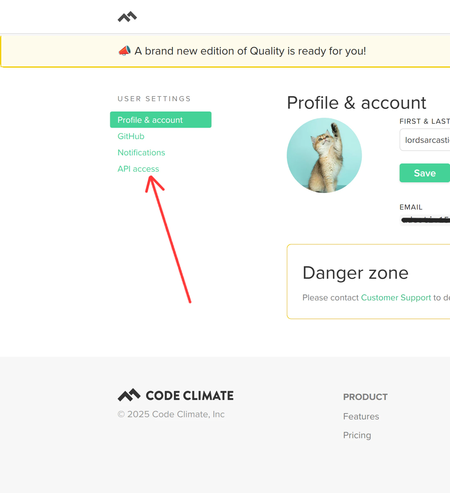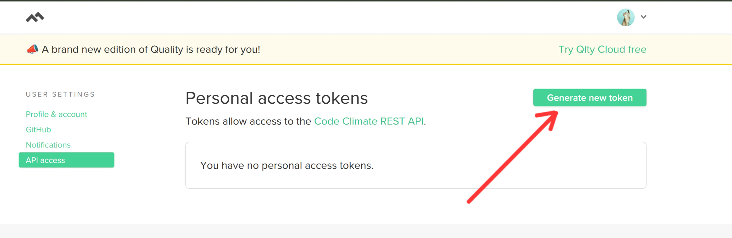 - From your Code Climate dashboard, hover over your profile icon in the top right corner. Click on User Settings.