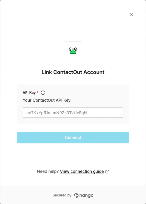 To connect ContactOut to Nango, you only need:- API Key – A key that grants Nango permission to interact with ContactOut’s API resources and services.