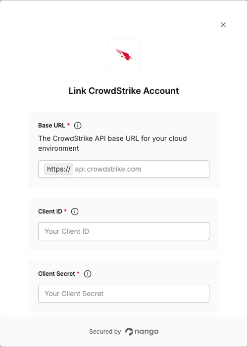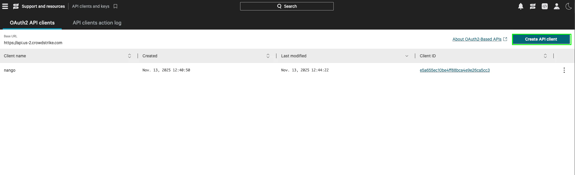 To authenticate with CrowdStrike, you need:- Client ID - A unique identifier for your API client.