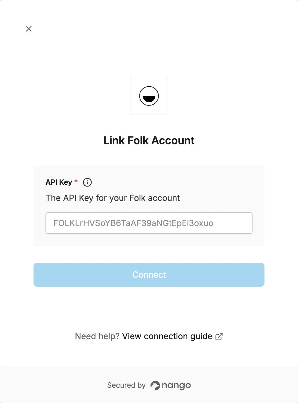 To authenticate with Folk, you need:- API Key - A key that grants Nango permission to interact with Folk’s API.