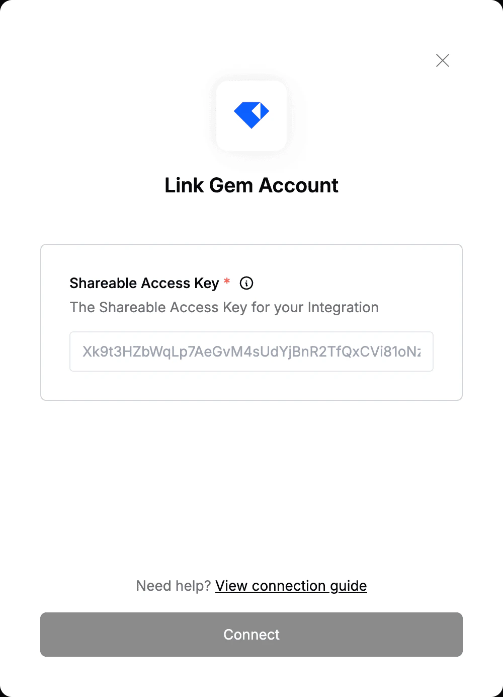 To authenticate with Gem, you need:- Shareable Access Key - A key that grants Nango permission to interact with Gem’s APIs resources and services.