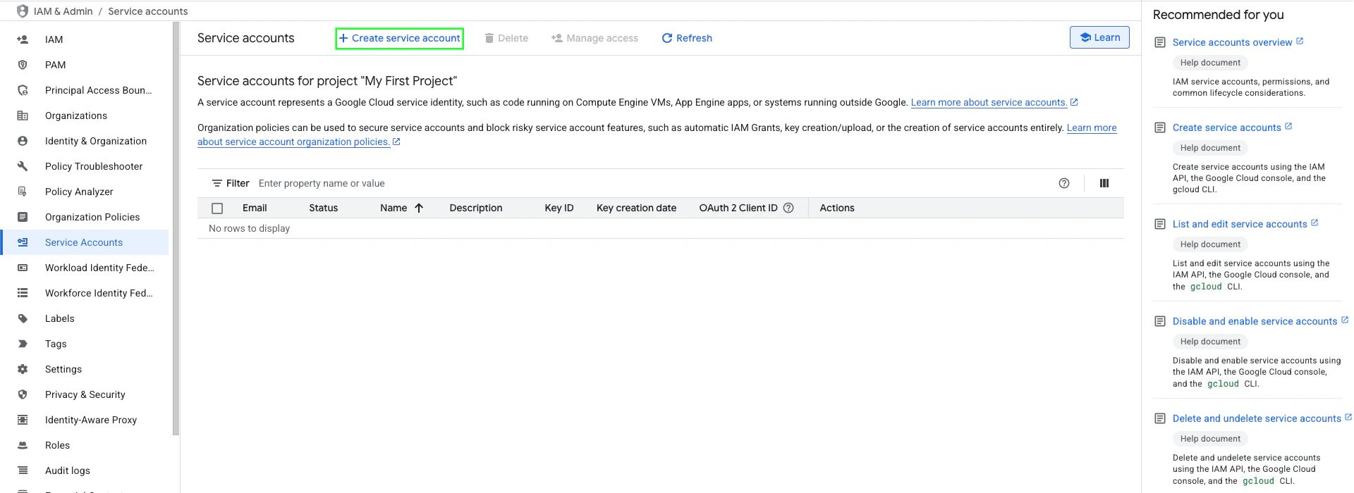 - Click + Create Service Account.