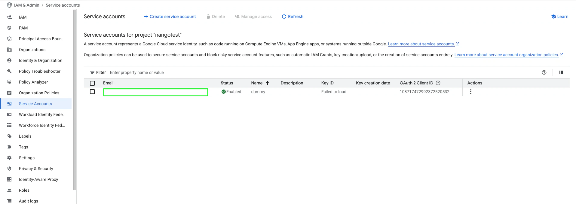 - From the Service accounts page, click the Email address of the service account you created.