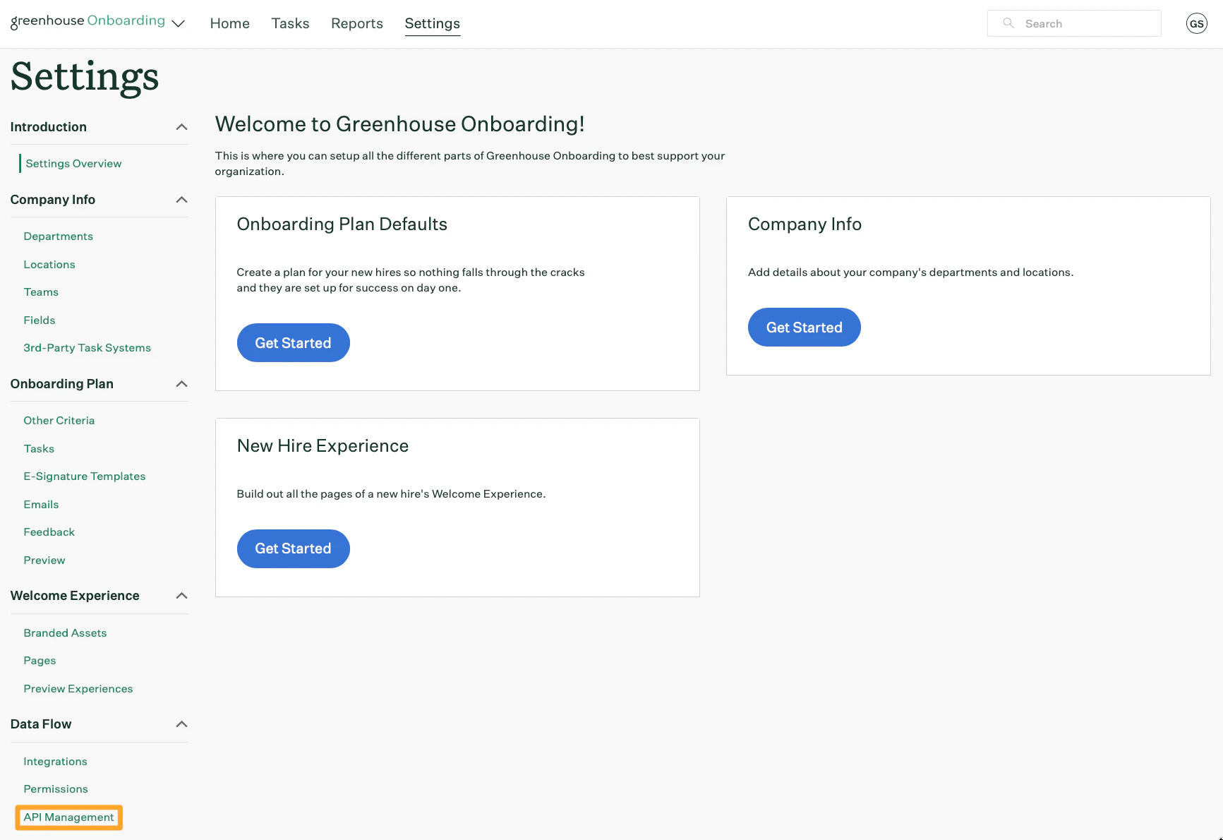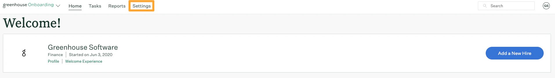 1. Log into your Greenhouse account and click Settings on your navigation bar.