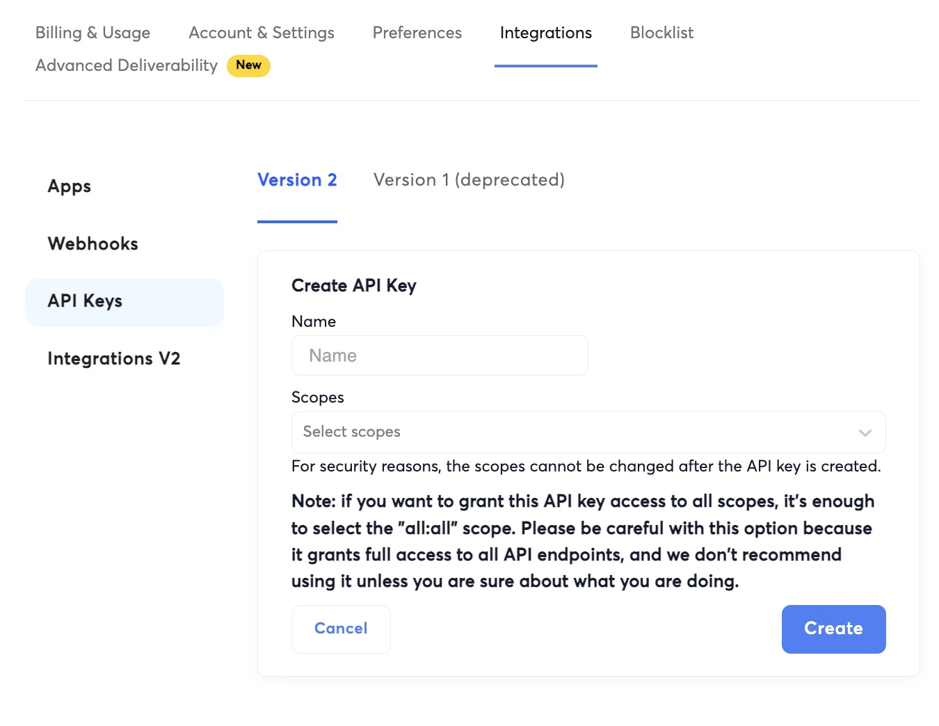 - Enter a Name and select Scopes you want this API Key to have access to.