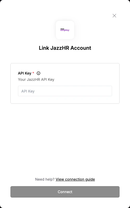 To authenticate with JazzHR, you need:- API Key – A key that grants Nango secure access to interact with JazzHR resources and services.