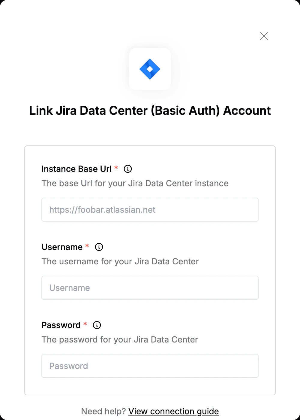 To authenticate with Jira Data Center (Basic Auth), you will need:- Instance Base Url - The root URL of your Jira Data Center instance.
