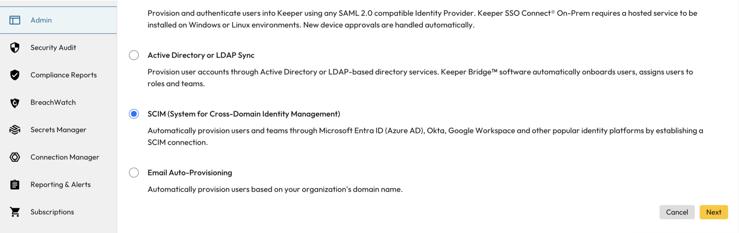 - Navigate and select SCIM (System for Cross-Domain Identity Management) and select Next.