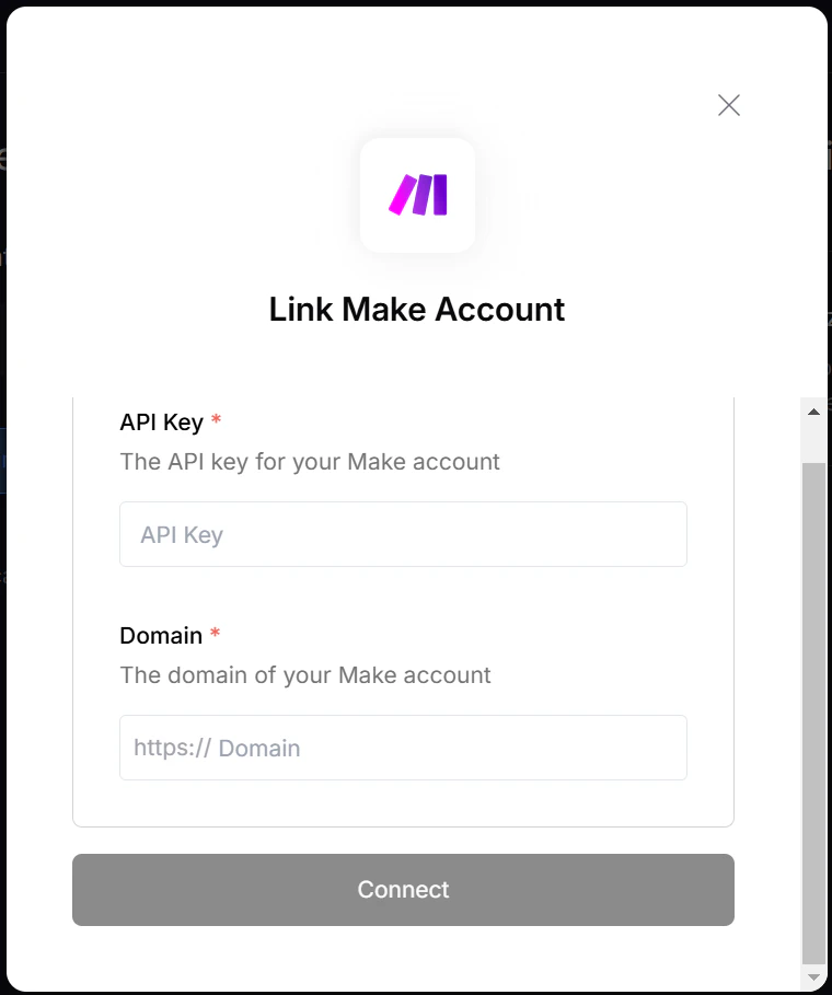 To link your Make account:- Navigate to the Make authentication form in your application.