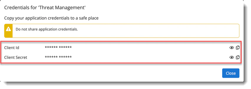 Copy and securely store both values immediately in a credentials vault. The Client Secret is only displayed once during the registration/configuration process and cannot be retrieved later. If you lose the Client Secret, you will need to regenerate it or create a new application.