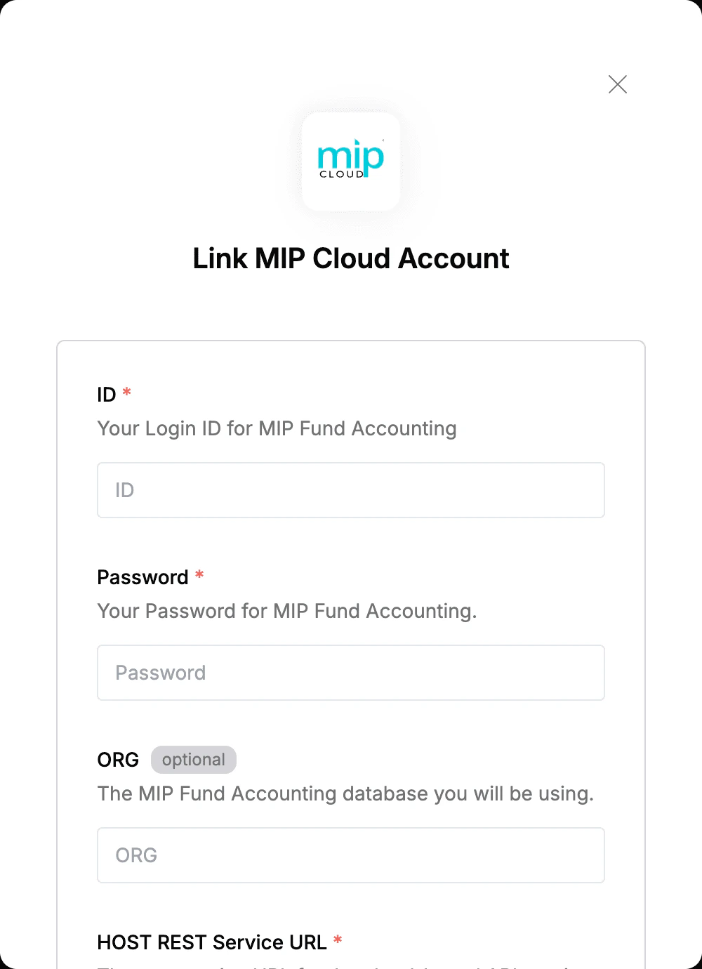 To authenticate with MIP Cloud, you need three key pieces of information: