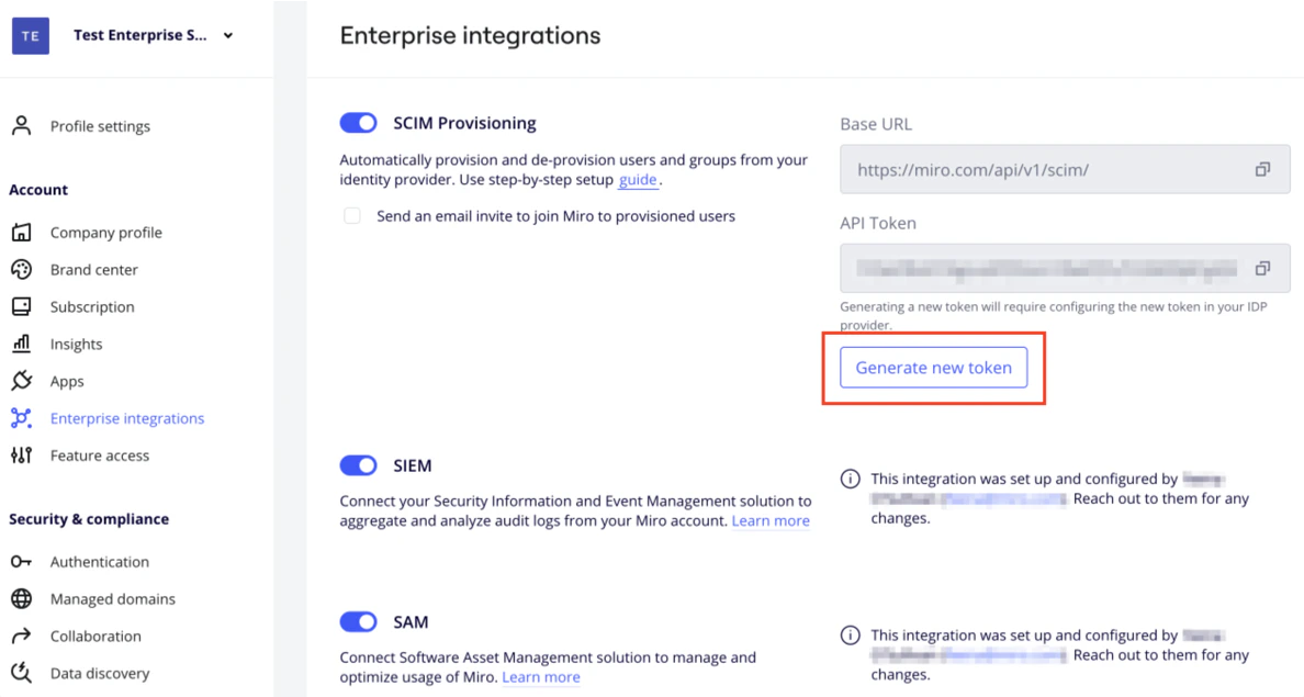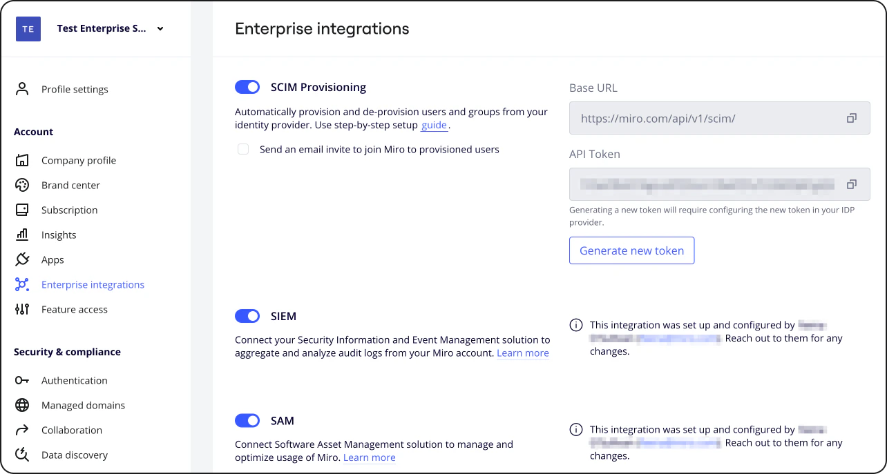 - Log in to your Enterprise Miro account. Once logged in, navigate to Company settings > Enterprise integrations, enable the SCIM Provisioning feature.