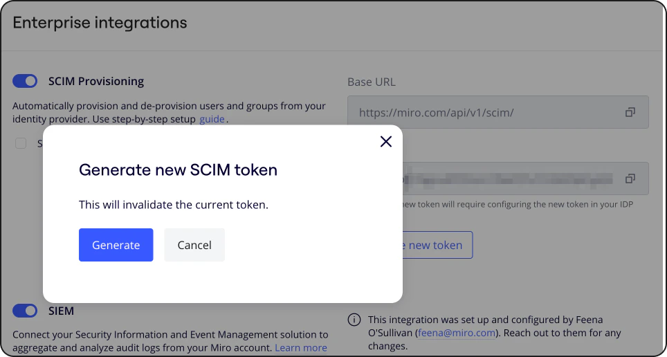 - If you already have an existing API Key you can skip this step and copy the existing key. To generate a new API Key (Token), navigate to Company settings > Enterprise integrations and click the “Generate new token” The Generate new SCIM token modal will appear, click Generate