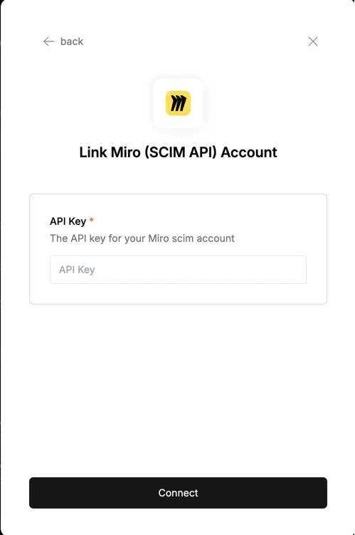To authenticate with Miro, you need one key piece of information:- API Key - Your Miro API Key