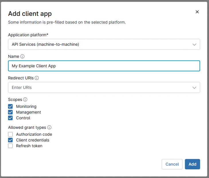 - Select the appropriate permissions for your application (Monitoring, Management, and/or Control).