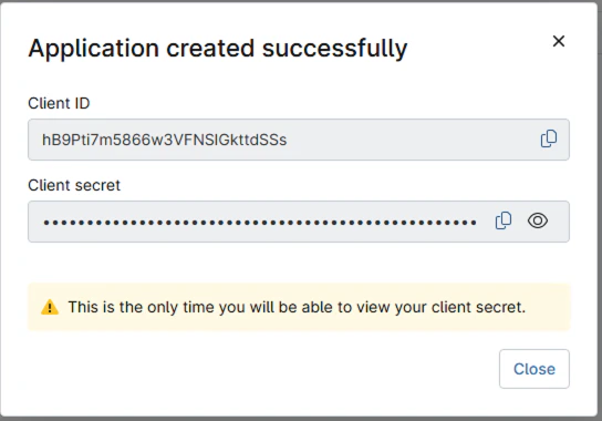 - Important: Copy and securely store both values immediately. The Client Secret is only shown once and cannot be retrieved later.
