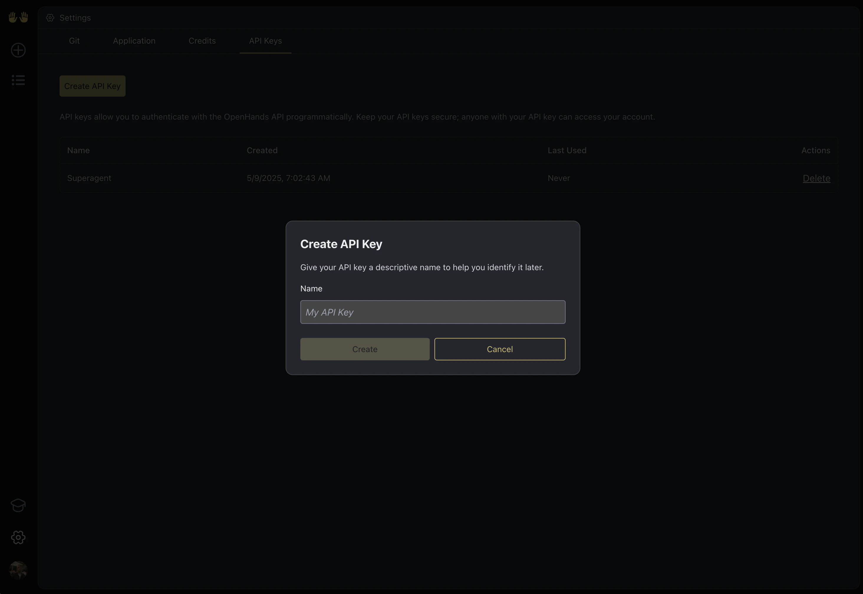 To authenticate with OpenHands, you need:- API Key - A key that grants Nango permission to interact with OpenHands’s APIs resources and services.