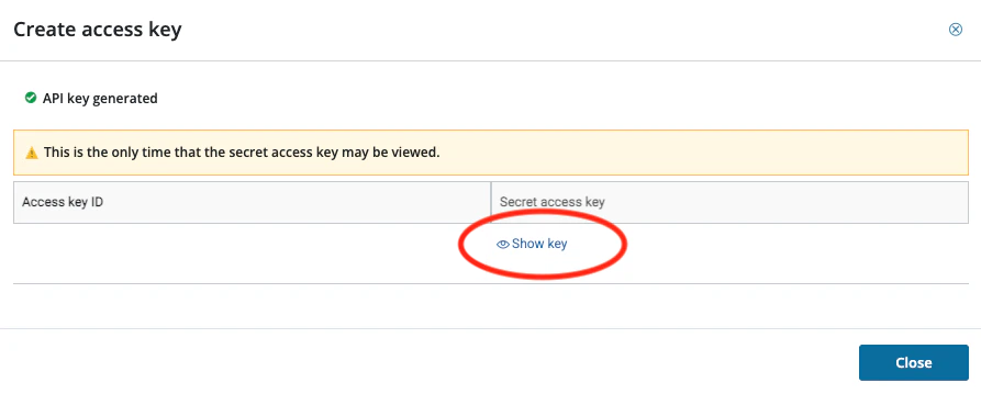 - View the Access key ID, then click Show key to reveal the Secret access key.
