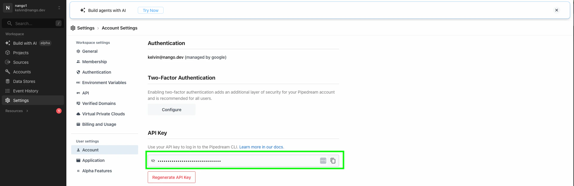 To authenticate with Pipedream (API Key), you need:- API key - A key that grants Nango permission to interact with Pipedream’s APIs resources and services.