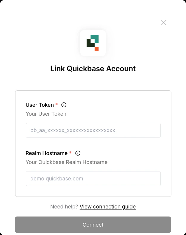 To authenticate with Quickbase, you will need:- Realm Hostname - The quickbase domain associated with your account