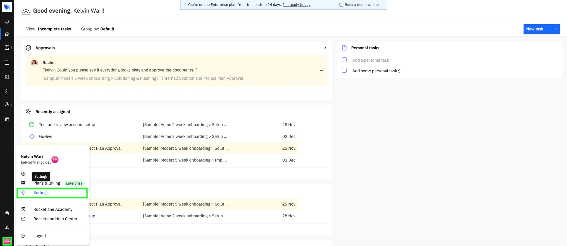 - Log in to your Rocketlane account, click on your profile, then click Settings.