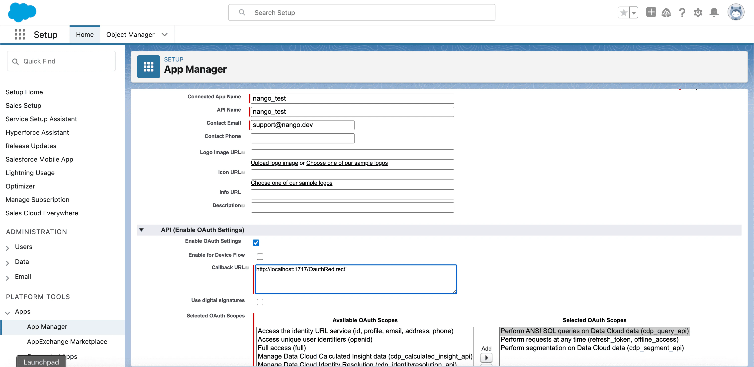 - Select Enable OAuth Settings.