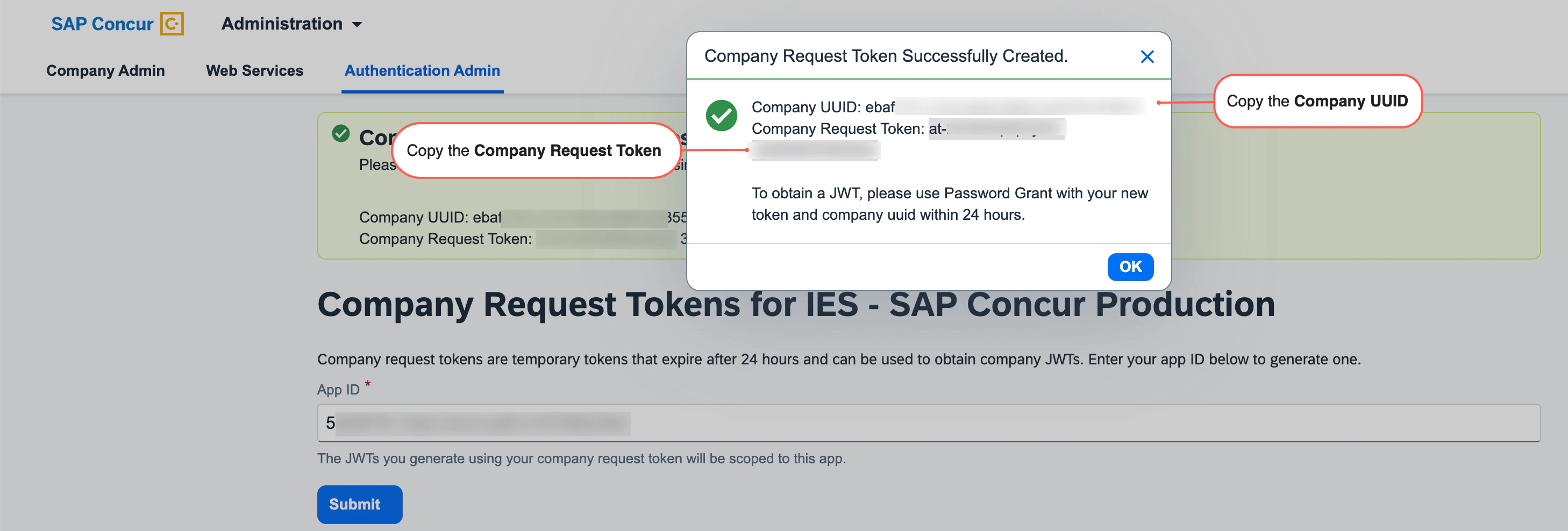 - In the admin panel, go to[Company Request Tokens]/(https://www.concursolutions.com/nui/authadmin/companytokens)