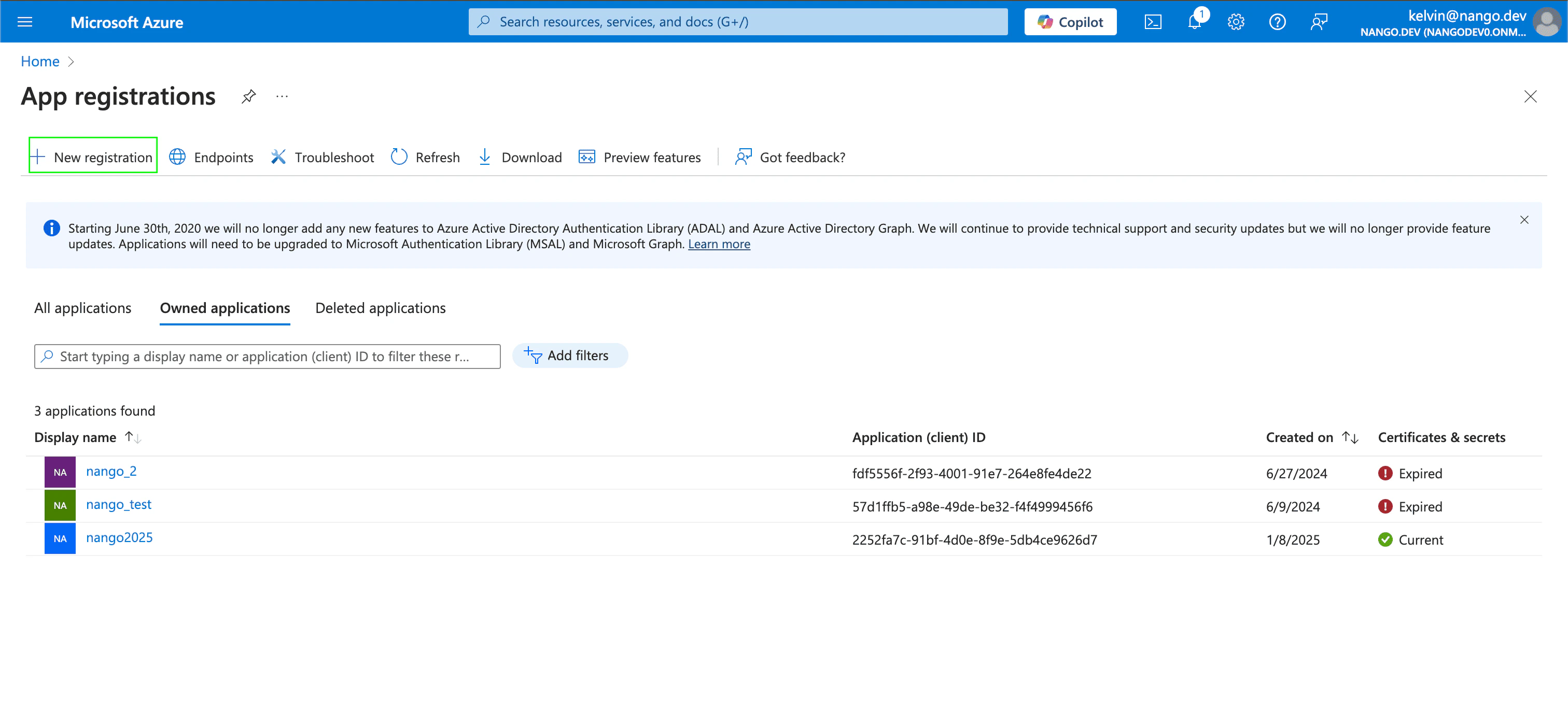 - After registering a new app in the step above, you can now generate a client secret for that specific application. Navigate to Certificates & secrets under Manage, and click New client secret.